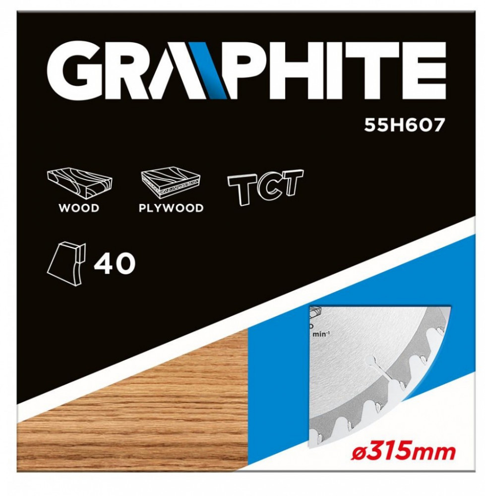 A GRAPHITE vídiabetétes fűrésztárcsa (kat. sz. 55H607) átmérővel 315 mm, a hőmérsékletnek és a deformálódásnak igen ellenálló MN65-ös mangán acélötvözetből készül. Az YG6A vídiabetétes fogazás lehetővé teszi a fa és faalapú anyagok, mint pl. a rétegelt lemez, a forgácslap vagy az MDF lapok nagyoló vágását. A csomagolásban megtalálható szűkítő gyűrűk lehetővé teszik a fűrésztárcsák alkalmazását a fűrészgép típusok többségéhez.