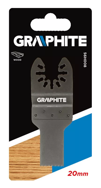 Fűrészlap többfunkciós géphez, HCS, fához, szélessége 20 mm GRAPHITE merülő fűrészlap (cikkszám: 56H008) szélesség 20 mm edzett szénacélból. Lehetővé teszi fa munkadarabok precíz vágását nehezen hozzáférhető helyeken a GRAPHITE multifunkcionális szerszámgéppel.