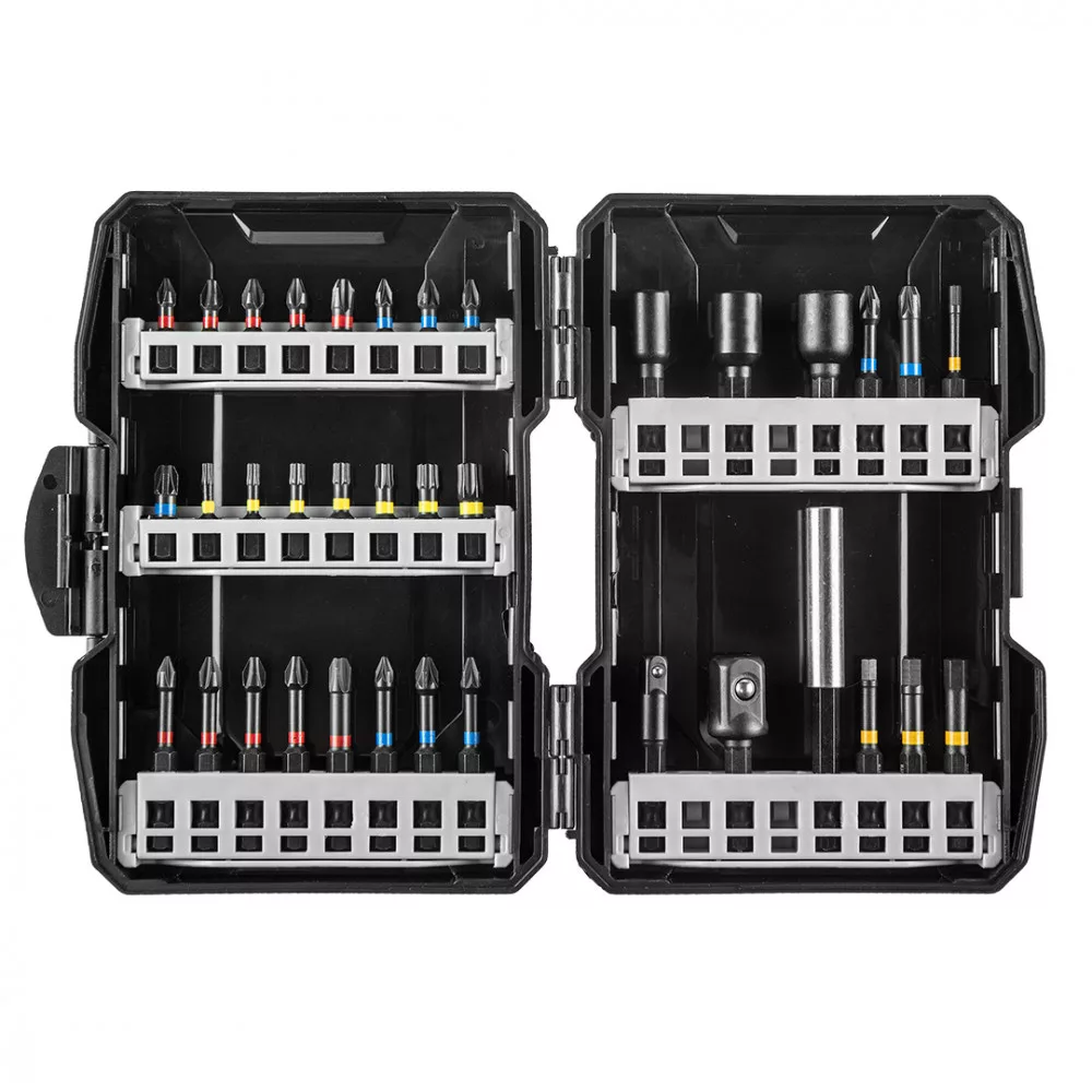 Torziós bitkészlet, 16 x PH1 / 2/2/2/3, PZ1 / 2/2/3, TX10 / 15/20/25/27/30/40, teljes hossz 25 mm, 14 x PH1 / 2/2 / 2/3, PZ1 / 2/2/2/3, HEX3 / 4/5/6 teljes hossz 50 mm, 3 x aljzat 6, 8, 10 mm, hosszúság 48 mm, 1 x fogantyú 90 mm, 2 x adapter1 / 4 ", 1/2 ", hosszúság 50 mm acél S2, hajtás 1/4 ", 36 db.