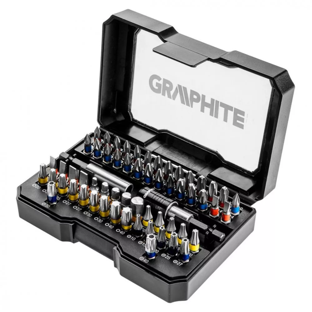 GRAPHITE Nagy, univerzális csavarbehajtó bit készlet (kat.sz. 56H600), a csavarbehajtáshoz szükséges különböző típusú biteket tartalmazza. A leggyakrabban használt méretek (PH2, PZ2 ..) többször megismételve.