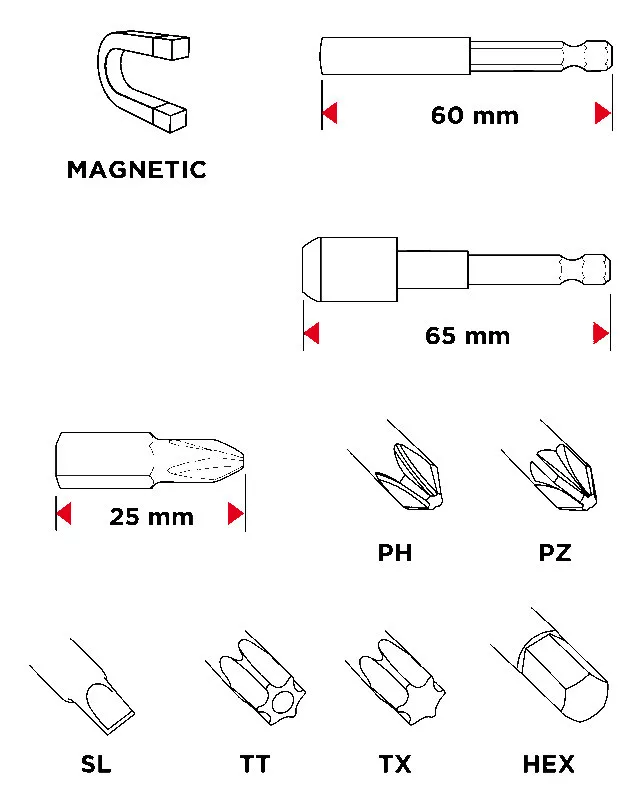 Csavarbehajtó bit készlet, 60 db, S2 acél, 25 mm-es bitek - 58 db, 2 db mágneses bit toldószár.