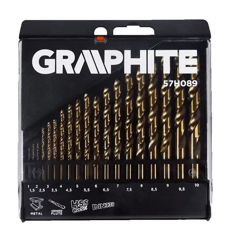 A fémfúrószárak GRAPHITE (kat.sz. 57H089) 1.0 mm és 10 mm átmérővel, kiváló minőségű, 5% kobalttal adalékolt M35-ös gyorsvágó acél ötvözetből készülnek. A 135°-os csúcsszög és a kikönnyített keresztél könnyű fúráskezdést biztosít, pontozó használata nélkül is. Az ötvözet ellenálló-képessége a magas hőmérsékleteknek alkalmassá teszi a nehezen megmunkálható anyagokba is a fúrásra, pl. rozsdamentes, saválló, hőálló acélban.