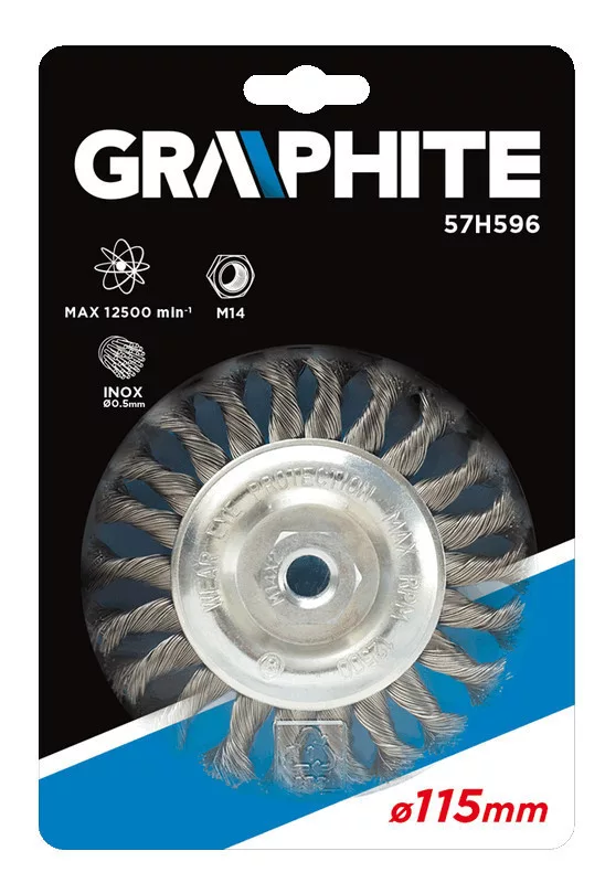 A GRAPHITE drótkefe 0,5 mm vastag rozsdamentes acél huzalból készül. A kefe megerősített kivitele lehetővé teszi a rozsdamentes és saválló acélból készült szerkezetek hatékony tisztítását. Rögzítése lehetővé teszi használatát sarokcsiszolókban.