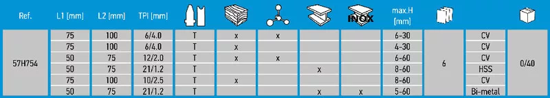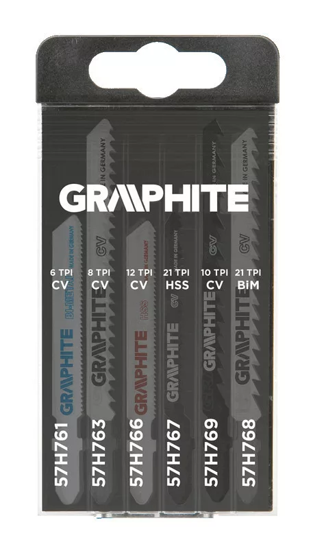 A GRAPHITE szúrófűrészlap készletben 6 db, különféle anyagok vágására szolgáló penge található. Fa vágására 4 fűrészpenge (nagyoló, pontos, valamint íves vágáshoz), 1 penge fém vágására, 1 pedig univerzális, fához és fémhez is. Mindegyik penge népszerű T típusú befogású, így használhatók a piacon kapható szúrófűrészek többségében.