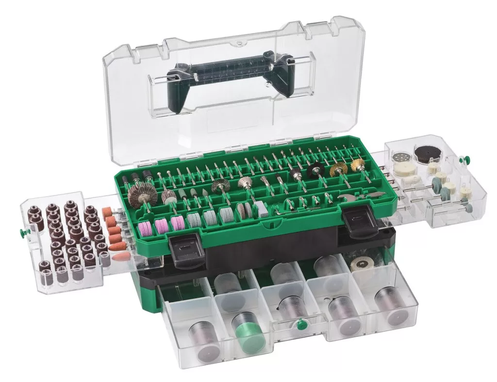 6 x alumínium-oxid köszörűkő szárral 9 x alumínium oxid köszörűkő 4 x szilícium-karbid csiszolókő szárral 10 x szilícium-karbid csiszolókő, 8 x kefe 1 x polírpaszta 80 x nagy teljesítményű vágótárcsa 36 x normál vágótárcsa, 135 x csiszolótárcsa 3 x gumi csiszolóhenger szárral 4 x krómozott patron (1,6 / 2,4 / 2 x 3,2) 2 x lamellás csiszoló, 5 x üvegszálas vágótárcsa 2 x csavarkulcs, 2 x polírtárcsa, 1 x csiszolókő |