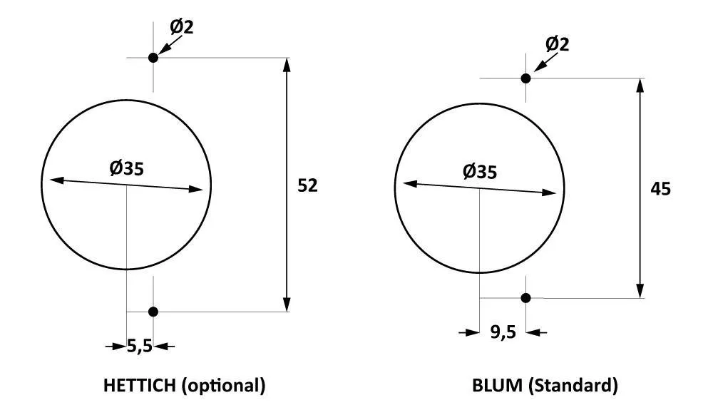 - Blum fúrási mintával , átalakítható Hettich fúrási mintához , opcionálisan rendelhető Hettich fejjel lehetséges.