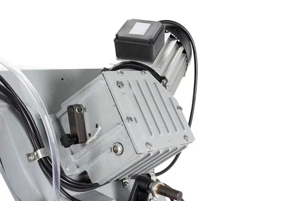 Fém szalagfűrész sebességváltóval, automatikus végütközővel, golyóscsapágyas fűrészszalag-vezetővel, fém forgácsleválasztóval, hűtőfolyadék szivattyúval és tartállyal (25W, 10l) felszerelve.