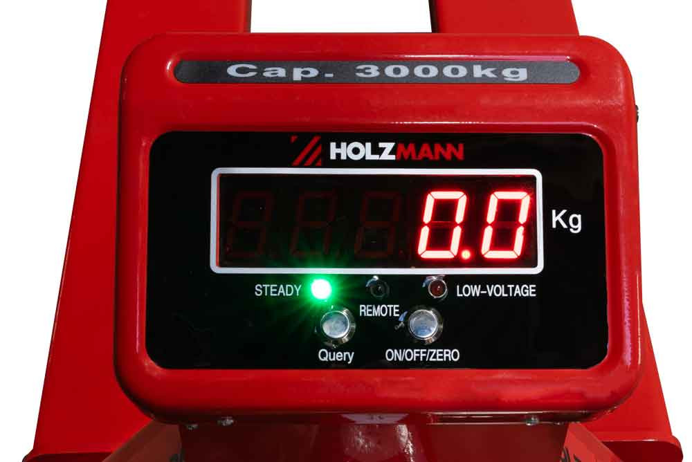 A HUB30KG mérőeszközzel ellátott HOLZMANN raklapemelő kocsi tandem kerekekkel és behúzó görgőkkel, valamint négy független mérőegységgel (érzékelővel) rendelkezik a hibamentes leolvasás érdekében. A kijelzési pontosság 0,5 kg. A raklapemelő kocsi kiváló minőségű acélból készült a maximális megbízhatóság érdekében. A gumírozott fogantyú és az ergonomikus vonórúd markolat megkönnyíti a kezelést, így az emelés/leengedés és a vezetés a lehető legkényelmesebb. A mérőegység be-, kikapcsolható vagy visszaállítható a kijelző vagy a távirányító segítségével. Könnyű és biztonságos kezelése nagyszerű szövetségessé teszi ezt a raklapemelő kocsit a raktárában az áruk súlyának nyomon követésekor. Minden iparág számára alkalmas, beleértve a logisztikát, a mezőgazdaságot, az építőipart, az autóipart, a textiliparot, a bútoripart stb.