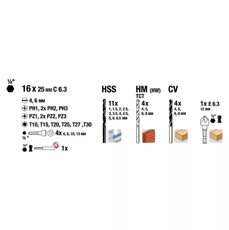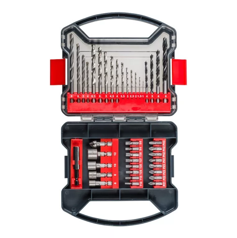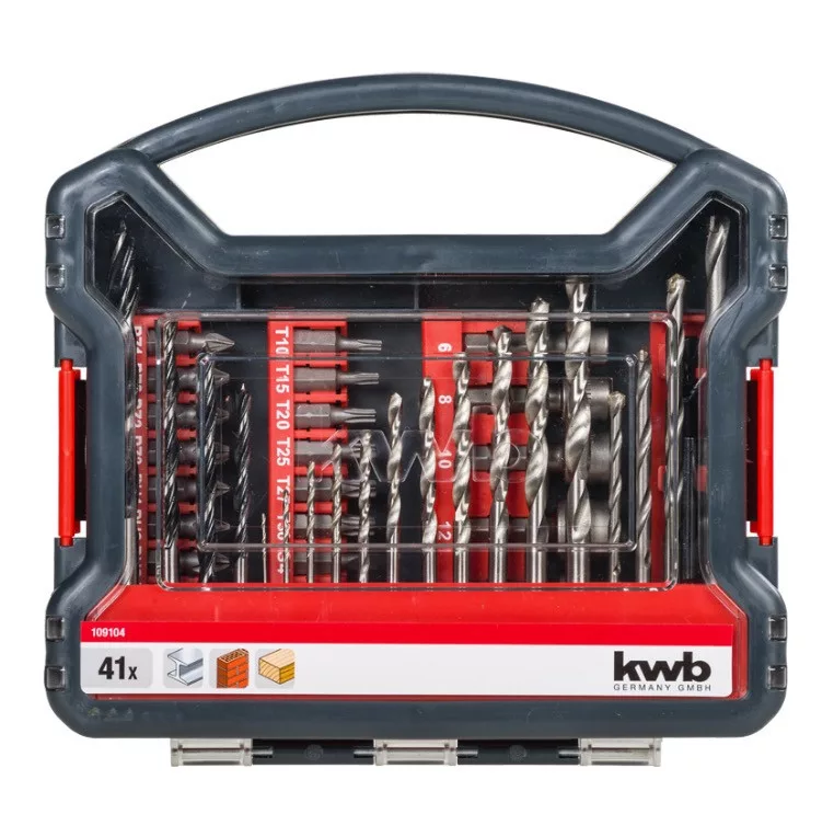 41 db-os power box fa, fém és kőzet fúrószárakkal, bitekkel, mely optimális kiegészítő minden vezeték nélküli csavarhúzó, fúró és vezeték nélküli fúrógép számára.