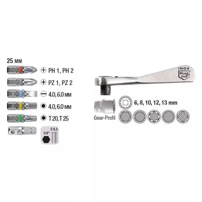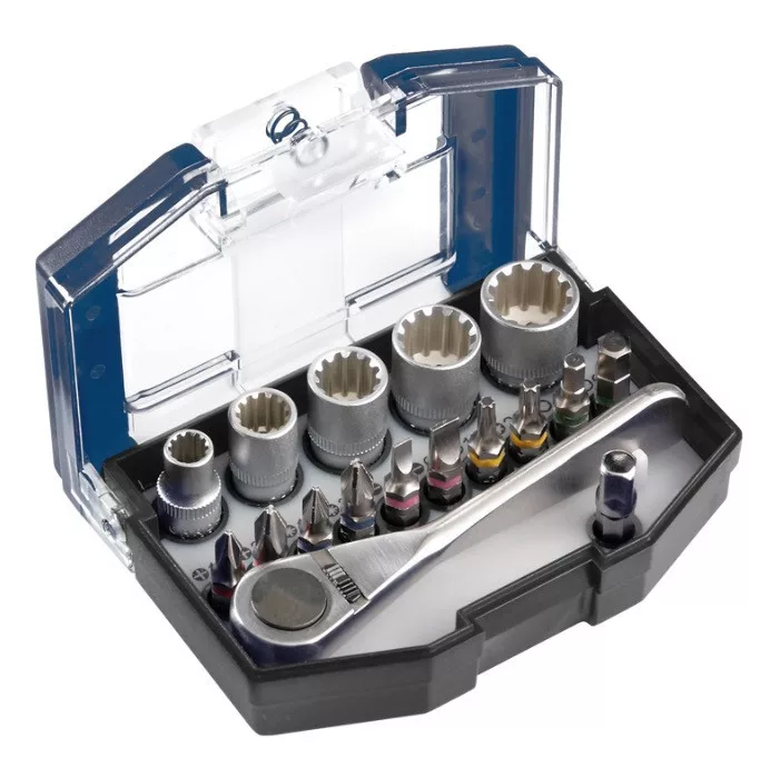 17 db-os bit és dugókészlet ipari minőségű CrV dugókkal, valamint a leggyakoribb típusú bitekkel.