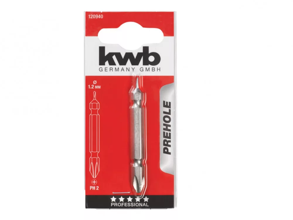 KWB 120940 PROFI PREHOLE PH2 Bit PH2-es behajtó bit süllyesztő előfúróval. Ideális 1,5 mm-es fúrólyuk előfúrásához és ellensúlyozásához faszerkezetes alátétekkel kombinálva.