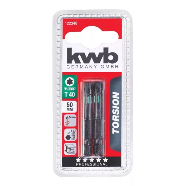 2 db T10-es, 50 mm-es torziós bit, mely különösen alkalmas kemény csavarkötések alkalmazásakor.