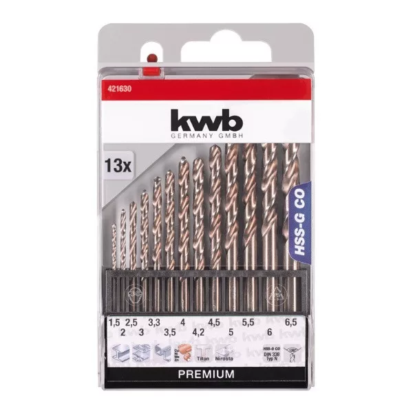 KWB 421600 PREMIUM HSS-G CO COBALT TWIST DRILL Hengeres spirálfúrószár készlet 13 db-os, 5% kobalt tartalmú hengeres spirálfúrószár készlet 1.5-6.5 mm + 3.3, 4.2 mm-es méretekben.