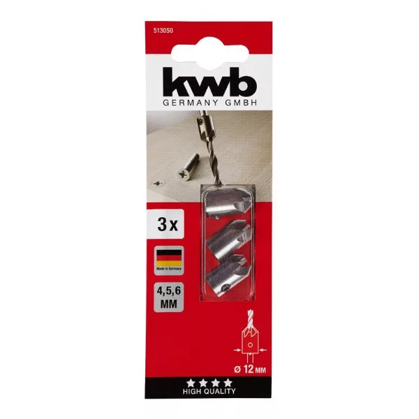 KWB 513050 PREMIUM CS Kúpsüllyesztő adapter készlet3 db-os, 4/5/6 x 12 x 19 mm-es, 90°-os CS szénacél kúpsüllyesztő adapter készlet HSS fúrószárhoz, fa és színesfémek fúrására.