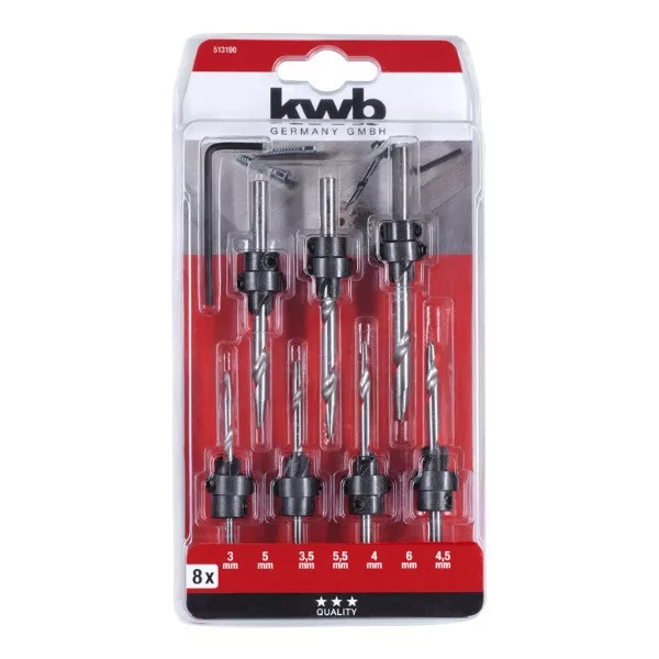 KWB 513190 PREMIUM C45 Süllyesztő fúró készlet8 db-os 3.0, 3.5, 4.0, 4.5, 5.0, 5.5, 6.0 mm-es CrV acél fa fúrófej készlet.