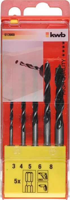 KWB Fa fúró készlet, 1/4 "-os hatlapú csatlakozóval 5 db.(513900)Lágy és keményfához.Méret: 3-4-5-6-8mm.