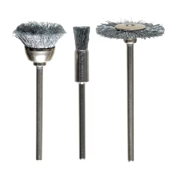 3 db-os, 2.34 mm-es csapos befogású, krimpelt drót csiszoló készlet finom munkákhoz: portalanításhoz, festékeltávolításhoz, tisztításhoz és mattításhoz.