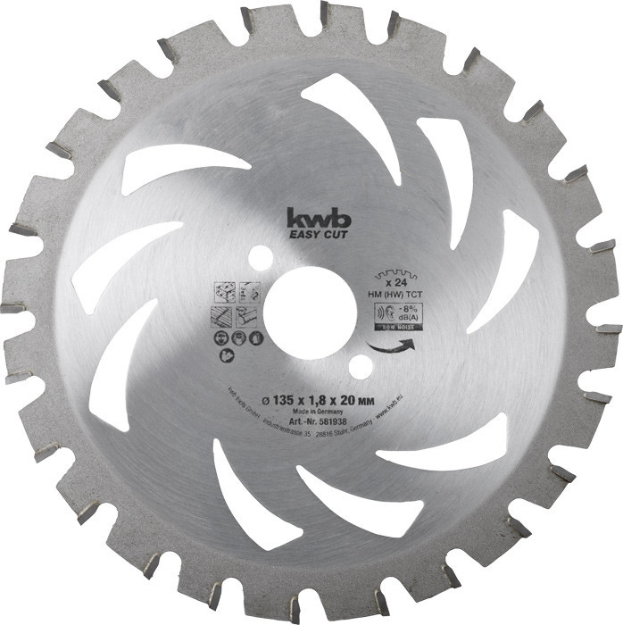 Keményfém hegyű, precíz, tiszta vágások. Speciális váltófogak, kézi körfűrészekhez. Aszimmetrikus fogosztás a legalább 30%-os zajcsökkentés érdekében. Forgácslaphoz, faanyaghoz, fém- és alumíniumprofilokhoz, valamint műanyagokhoz, beleértve a plexit is.