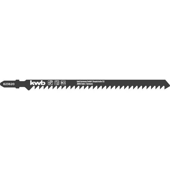 KWB PROFI EXTRA LONG HCS JIGSAW BLADES FOR WOODWORKING FOR JIGSAWS speciálisan edzett HCS szúrófűrészlapok különösen gyors, egyenes és szögmegtartó vágást tesznek lehetővé fában és olyan szerkezeti elemekben, mint a forgácslap és ácslap, ajtók, puha műanyag panelek és konyhai munkalapok, az extra vastag kialakítás megakadályozza, hogy a penge meghajoljon a vágási folyamat során. a 4.0 mm-es fogosztás a farostlemezen is áthatol, T-befogás