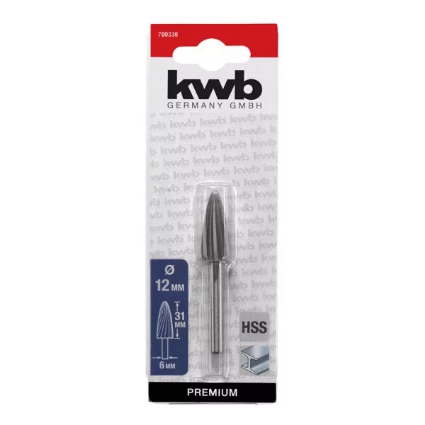 KWB 700330 PREMIUM HSS Turbómaró12 x 31 x 6 mm-es, gömbölyített végű kúp formájú, hengeres befogású turbómaró fémekhez.