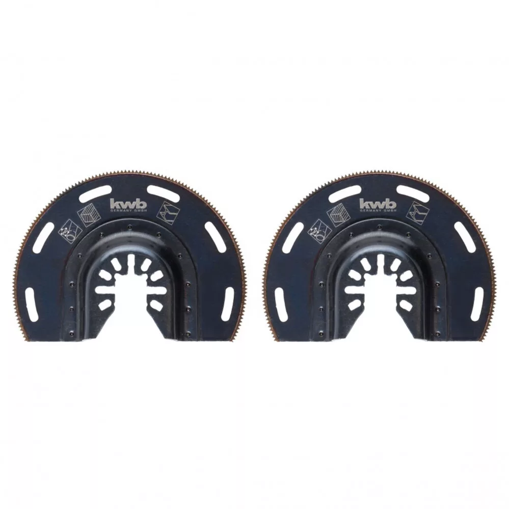 2 db 87 x 15 mm-es Bi-metal multi-szerszám félkör vágópenge szabadalmaztatott síklyukakkal.