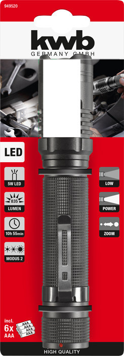 KWB 949520 LED zseblámpa (közepes)A kwb LED zseblámpa bárhol használható. Két, legfeljebb 835 lm fényáramú fénymód biztosítja a munkakörnyezethez igazított fényt. A kwb LED-es fáklya fokozatmentes zoom funkcióval rendelkezik az erős felületi fény vagy a spot világítás érdekében, forró pontok képződése nélkül. A lámpát az ANSI FL szabvány szerint tesztelik. Hat 1,5 V AAA elem (tartozék) biztosítja a megfelelő áramellátást. A ház ütésálló alumíniumból készült, és 1 méter magasságból ellenáll. A kiterjedt, csúszásgátló felület lehetővé teszi a biztonságos fogást és fogást - még kesztyű viselése esetén is. Az integrált kapocs azt jelenti, hogy a kwb LED-es fáklya táskákhoz és munkaruhákhoz rögzíthető.