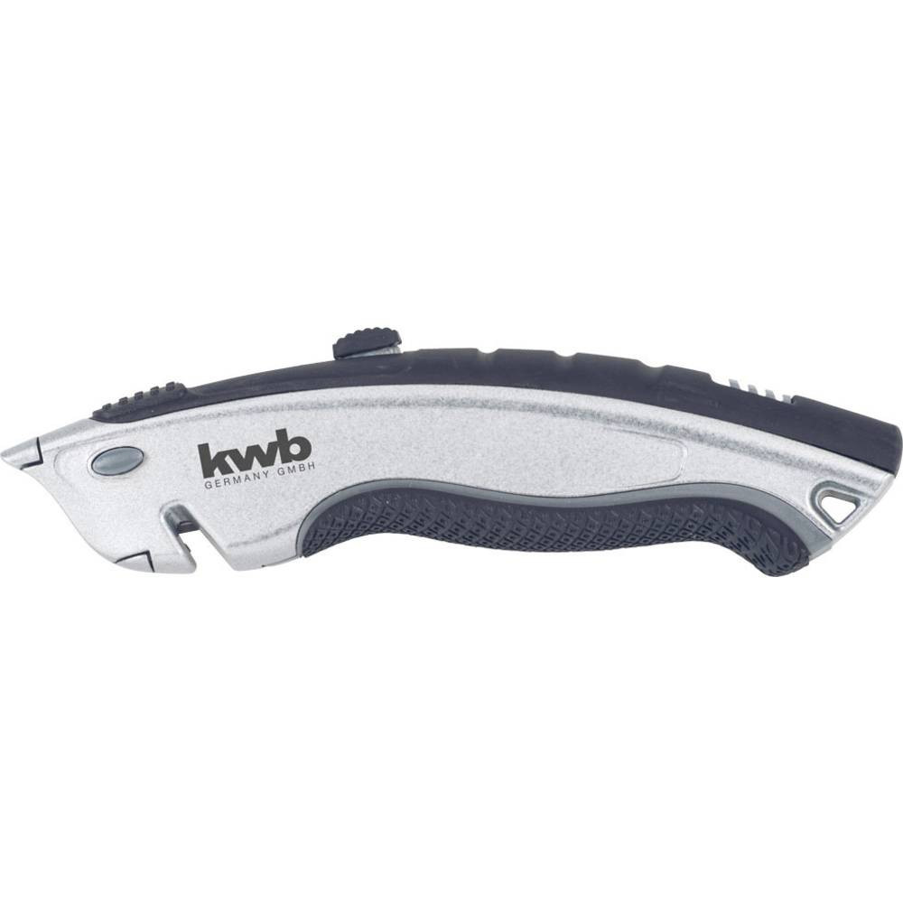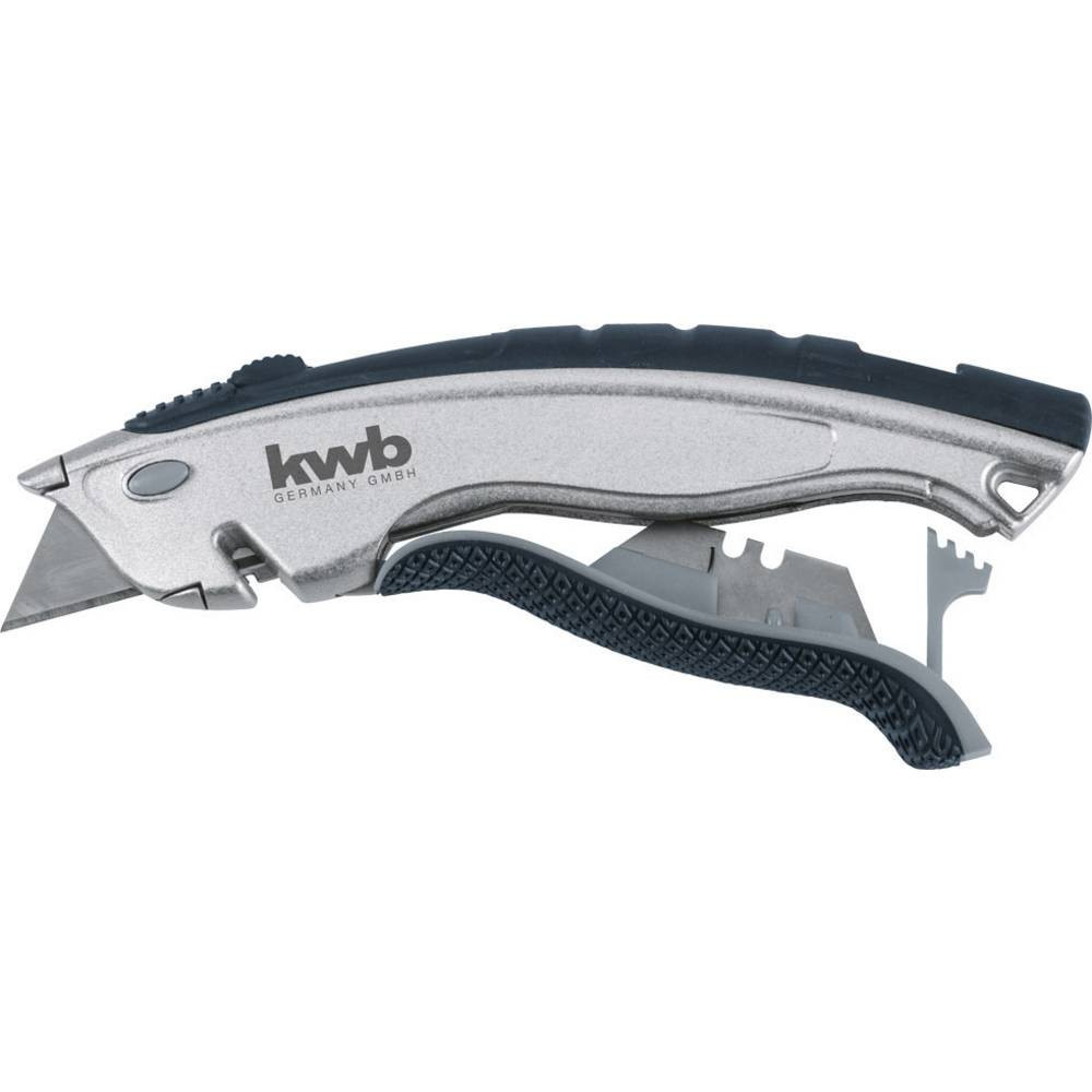 1 darab 60 x 19 mm-es trapéz pengével és 3 tartalék trapéz pengével a fogantyúban, beépített huzalvágó, ergonómiai alakú kétkomponensű gumi fogantyú a biztonságos tartáshoz