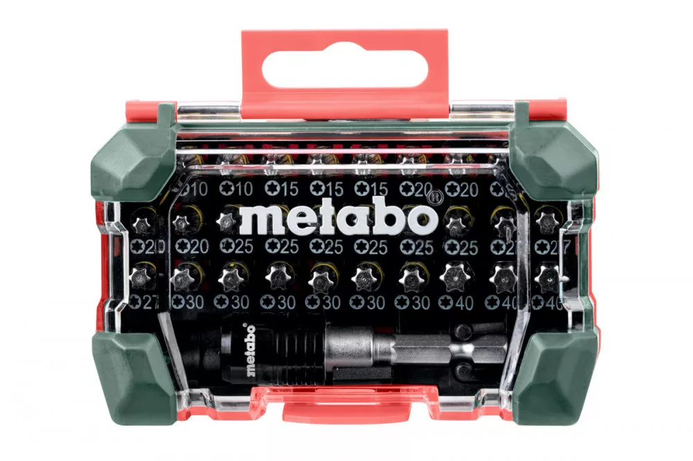 Tartalma: S 2 bitek, H= 25 mm, Méret: 3 db T10; 3 db T15; 6 db T20; 6 db T25; 3 db T27; 6 db T30; 4 db T40, 1 db mágneses gyorscserélő bittartó, 65 mm, Króm-vanádium acél bitek (S2-minőség); bitek színkódolással: a megfelelő bit gyorsan és egyszerűen megtalálható; Kiváló minőségű, robusztus doboz speciális Metabo dizájnnal