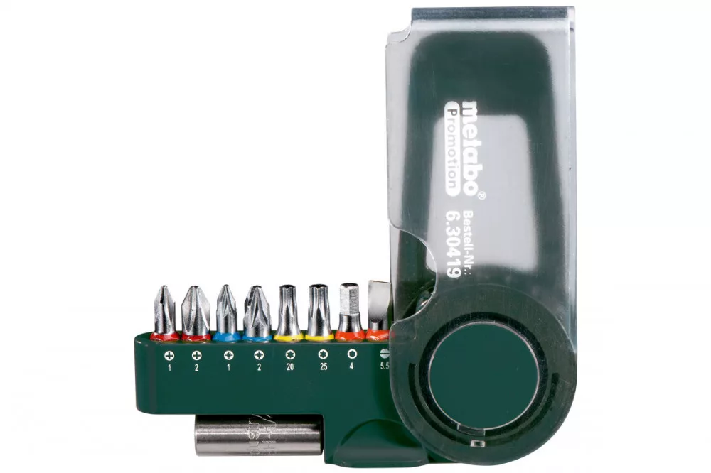 Tartalma: S 2 bitek, H= 25 mm, PH1; PH2; PZ1; PZ2; H4; T20; T25; SL5,5, 1 db mágneses bittartó, Bitek króm-vanádium acélból (S2 minőség); színkóddal ellátott bitek: a megfelelő bit gyors és egyszerű megtalálásához; kiváló minőségű, robusztus doboz