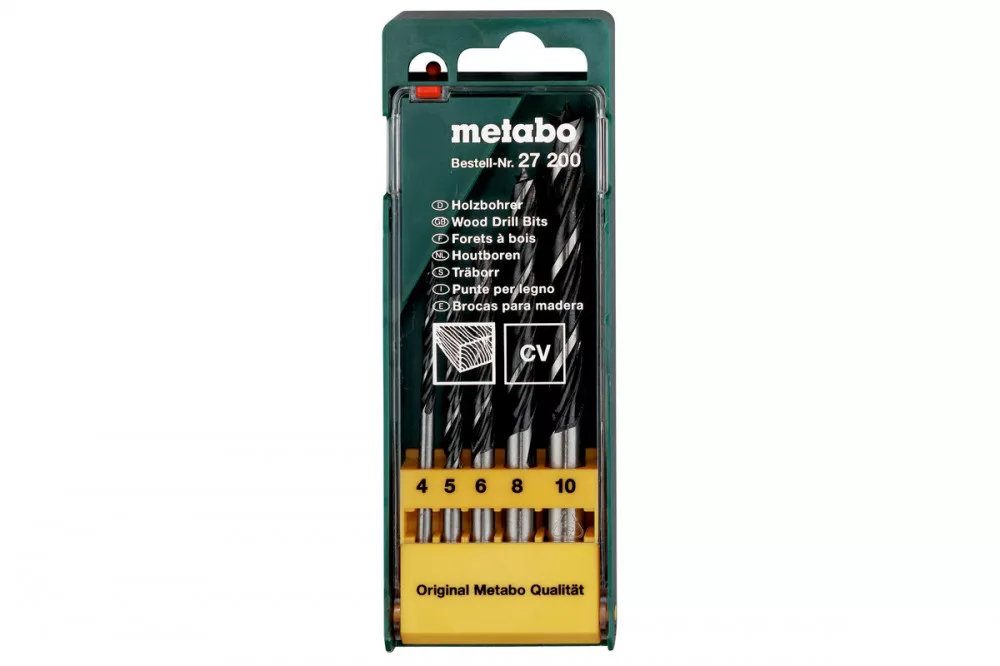 Csigafúró fához kiváló minőségű szerszámacélból, edzett, központosító csúccsal, Kemény- és puhafában, rétegelt falemezben, faforgácslapokban, stb. használható, 5 részes, műanyag dobozban, átmérő: 4 / 5 / 6 / 8 / 10 mm