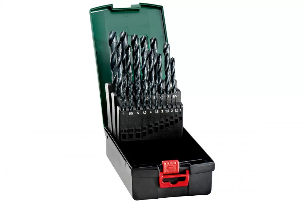 Csigafúró HSS, DIN 338, hengerelt, hengeres, jobb vágásirányú, N típus, Kúppalást-köszörülés 118°, átmérő-tűrés h8, Átmérő tűréshatár h8, Fekete felület, Alkalmazható acél, nemvas fémek, ötvözött és ötvözetlen acélöntvény fúrásához. 900 N/mm² szakítószilárdságig., 25 részes, robusztus műanyag dobozban, átmérő: 1 / 1,5 / 2 / 2,5 / 3 / 3,5 / 4 / 4,5 / 5 / 5,5 / 6 / 6,5 / 7 / 7,5 / 8 / 8,5 / 9 / 9,5 / 10 / 10,5 / 11 / 11,5 / 12 / 12,5 / 13 mm