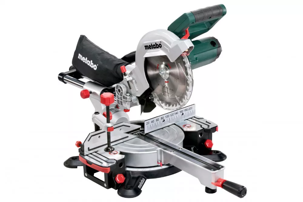 Keményfém fűrészlap (40 fog), 2 db beépített asztalszélesítő, Daraboló ütköző, Anyagleszorító, Szerszám a fűrészlapcseréhez, Kábelfelcsévélés, Forgácsgyűjtő zsák