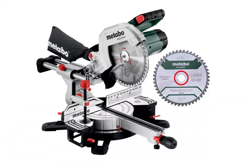 Fűrészlap "Precision cut wood - classic" 254x30 Z48, második keményfém fűrészlap, 2 db beépített asztalszélesítő, Daraboló ütköző, Anyagleszorító, Szerszám a fűrészlapcseréhez, Kábelfelcsévélés, Forgácsgyűjtő zsák