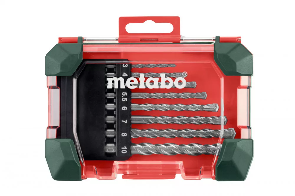 Kőfúró fúró és ütvefúrókhoz, Mart kivitel, keményfém lapka 130°, Robusztus kivitel, Alkalmazható tégla, falazat és természetes kövekben végzett fúrásokhoz stb., 8 db-os, kiváló minőségű, robusztus műanyag dobozban, speciális Metabo dizájnnal, kihúzható Euroloch-akasztóval; Keményfém kőzetfúrók fúró- és ütvefúrógéphez, mart kivitelű fúrószár, alkalmas téglába, falazatba stb. való fúráshoz., átmérő: 3 / 4 / 5 / 5,5 / 6 / 7 / 8 / 10 mm