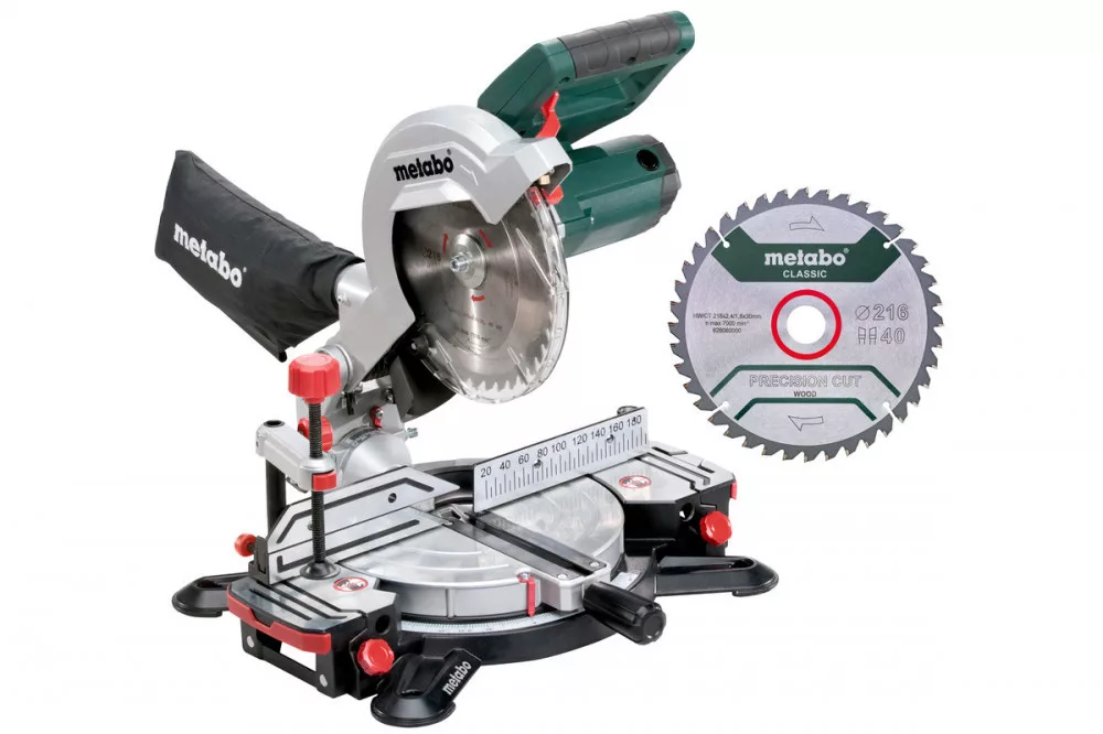 Keményfém fűrészlap (40 fog), második keményfém fűrészlap, 2 db beépített asztalszélesítő, Daraboló ütköző, Anyagleszorító, Szerszám a fűrészlapcseréhez, Forgácsgyűjtő zsák