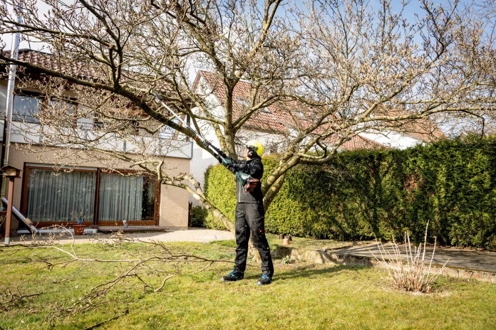 Biztonságos faápolás a Metabo multifunkciós rendszerébe tartozó magassági ágvágó adapterrel, a rendszer sok kerti munkánál az "all in one" megoldást kínálja