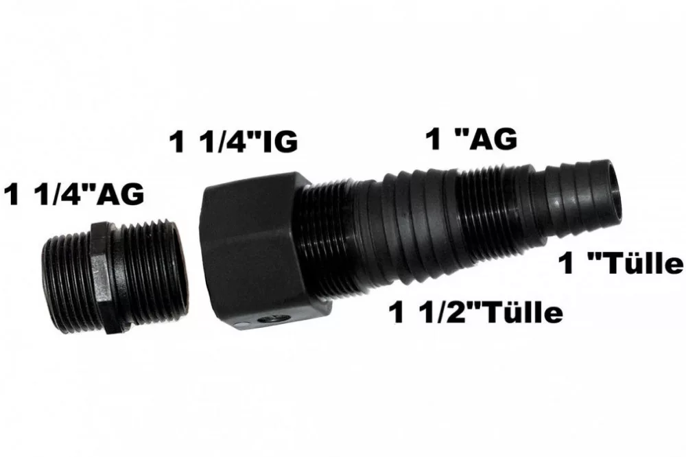 Búvárszivattyúk vagy házi vízművek lefolyó-, szívó vagy kerti tömlőkre való csatlakoztatásához, 1 1/4" b.m. x 1 1/2" csővég x 1" k.m. x 1" csővég, Kettős közcsavar 1 1/4" k.m.