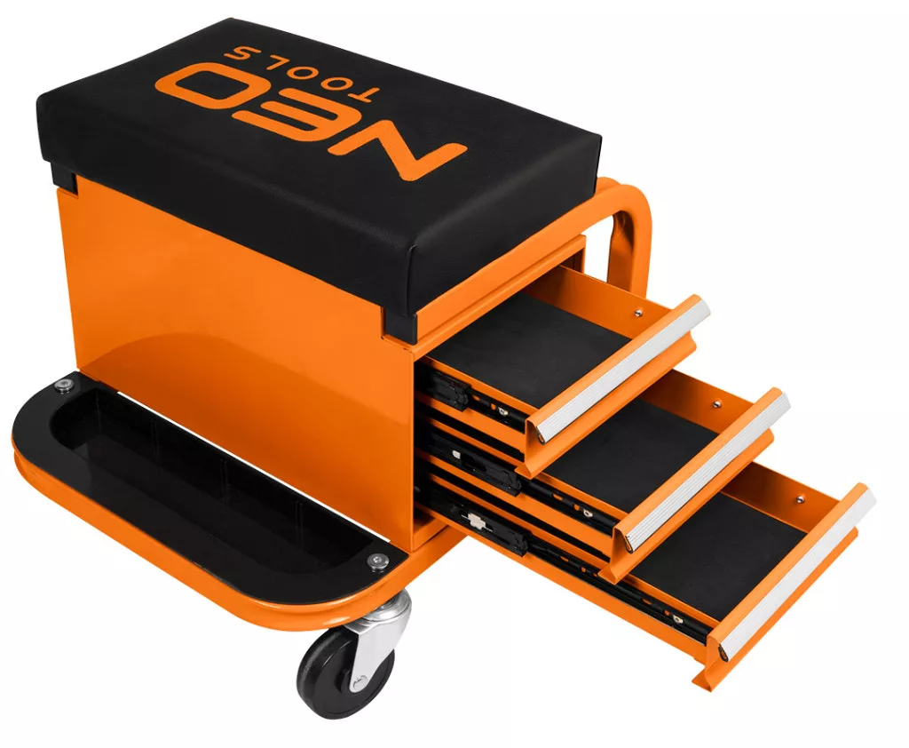 NEO 11-605 Szerelőszék, fém szerkezetű, kerekekkel, szerszámfiókokkal. A robusztus zsámoly porszórt acélszerkezettel és lángálló anyaggal bevont üléssel - megfelelő tartósságot és biztonságot biztosít. Maximális terhelhetősége 110 kg. Teljes mérete 38 x 39 x 37 cm, fiókjának mérete pedig 30 x 15 x 4 cm. Négy 360 fokban manőverezhető görgővel és három tartóval a dobozok, palackok vagy spray-k számára, kényelmet és komfortot biztosít. A porszórt bevonatnak köszönhetően hosszú évekre garantálja a színtartósságot. Sok órán át tartó műhelymunkák során is jól fog működni.