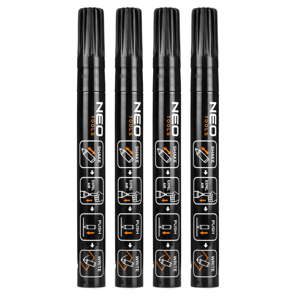 NEO 13-850 4db jelölőfilc, lakkfilc, vízálló festékkel, alu festéktartály házzal, fekete, vastag hegyű. Egy 4 darabos készlet vastag, kerek hegyű, 4,4 mm átmérőjű építőmarker. Különböző felületeken ajánlott a használatuk, többek között: fém, üveg, kő, fa és műanyag. Fekete lakk, tartós, gyorsan száradó és vízálló tulajdonságokkal rendelkezik. Könnyű alumíniumtest, amely megakadályozza a tinta kiszáradását, a toll így hónapokig használatra készen áll. A NEO TOOLS márkájú építőipari filctollak számos munkahelyi és otthoni projekthez jól használhatóak.
