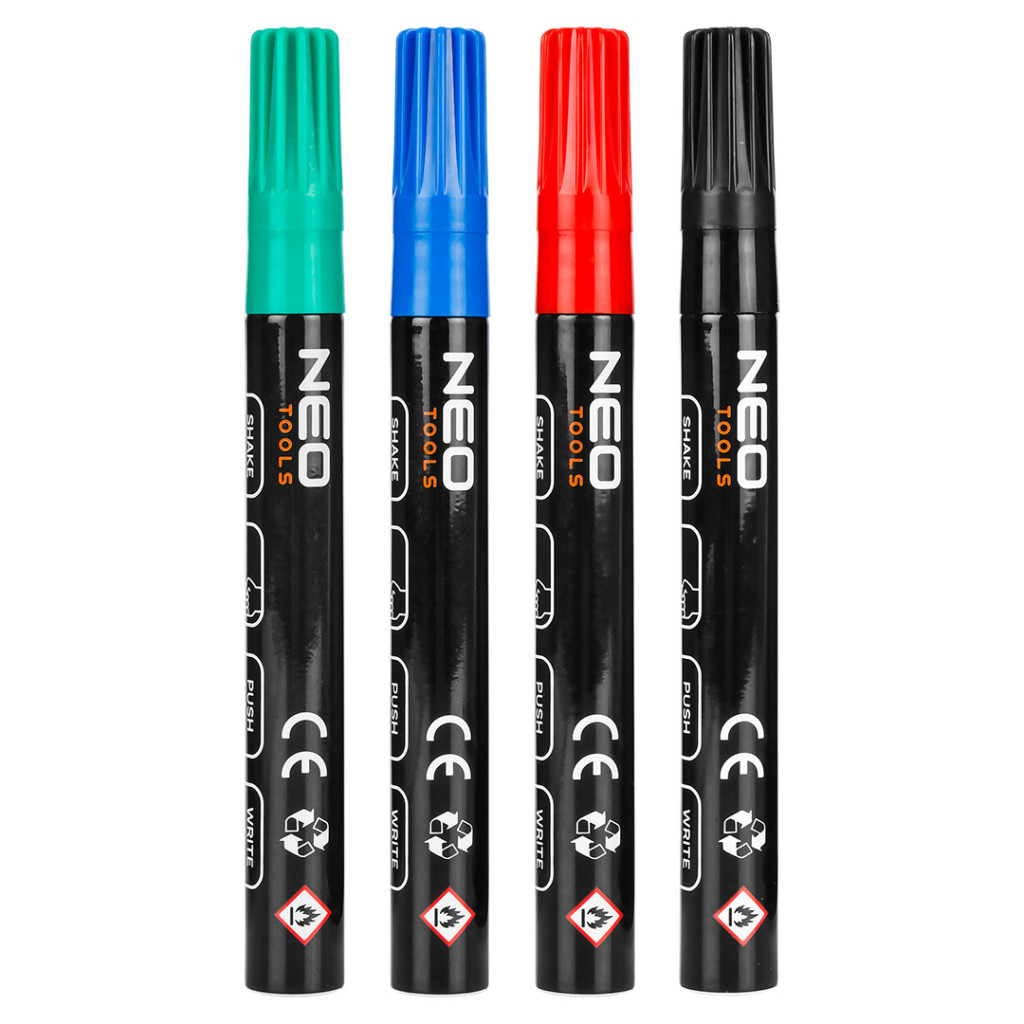 NEO 13-851 4db jelölőfilc, lakkfilc, vízálló festékkel, alu festéktartály házzal, színes, vastag hegyű. Vastag építőmarker, 4 színű, tartós, vízálló, lakkfesték, alumínium ház, 4 darab, fekete, piros, zöld, kék. 4,4 mm-es kerek hegyű. Különböző felületeken ajánlott a használatuk, többek között: fém, üveg, kő, fa és műanyag. Lakkfesték jellemzi őket, tartósak, gyorsan száradnak és vízállóak. Könnyű alumínium burkolatuknak köszönhetően, amely megakadályozza a tinta kiszáradását, hónapokig használatra készen állnak. A NEO TOOLS márkájú építőipari jelölők számos munkahelyi és otthoni projekthez hasznosnak bizonyulnak.