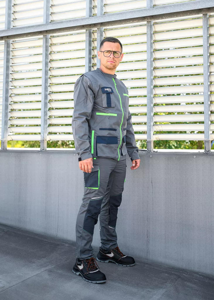 PREMIUM NEO munkadzseki 100% pamutból készült,használható szakmai és otthoni munkákhoz. Ripstop anyagból készül, amely megakadályozza a ruhadarab további szakadását. A levehető ujjaknak köszönhetően a munkadzseki mellényé alakítható. A munkadzseki álló gallérral, a hátán egyedi varrással,valamint állítható a csuklójánál a szabadabb mozgás érdekében. A munkadzseki többfunkciós, cipzáras és nyomógombos zsebekkel van ellátva,amelyek különböző szerszámok elhelyezésére alklmasak. A munkadzseki fényvisszaverő elemei a nap bármely szakában és a különböző időjárási körülmények között biztosítják a láthatóságot és a biztonságot. CE tanúsítvánnyal rendelkezik az EN ISO 13688:2013 szabvány szerint.