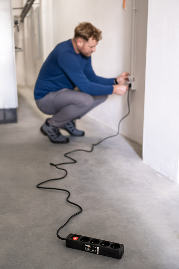 A NEO TOOLS 1,5 m, 3 x 1,5 mm², 3G, fekete, ON/OFF 90-182 szalaghosszabbító kábel egy 1,5 m hosszú hosszabbító kábel 3x 1,5 mm² rézhuzalokkal és 3 aljzattal. Jellemzője a fekete szín és az ON/OFF kapcsoló. A 230V-os 16A névleges áramával és 3680W-os maximális teljesítményével a legtöbb készüléket képes táplálni. A NEO TOOLS szalaghosszabbító E/F típusú dugóval és E típusú aljzattal rendelkezik. Hasznos, univerzális termék a biztonságos áramelágazáshoz.