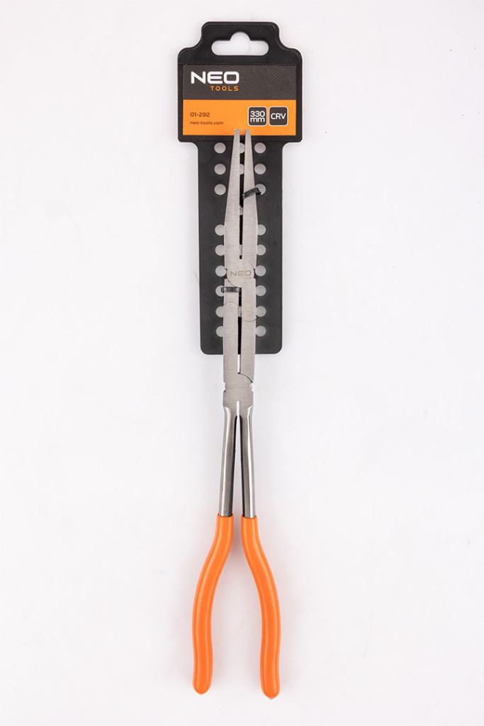 A NEO TOOLS CRV 01-290 dupla csuklós egyenes fogó 33 cm hosszú fogó. CrV acélból készülnek, és két ízület jellemzi őket, amelyek lehetővé teszik a nagy terhelések kezelését és a munkatartomány növelését. A fogantyúk PVC műanyaggal vannak bevonva. A NEO TOOLS fogók formája és a kettős csukló lehetővé teszi a nehezen hozzáférhető helyek elérését. A szerszám számos helyzetben hasznosnak bizonyul.