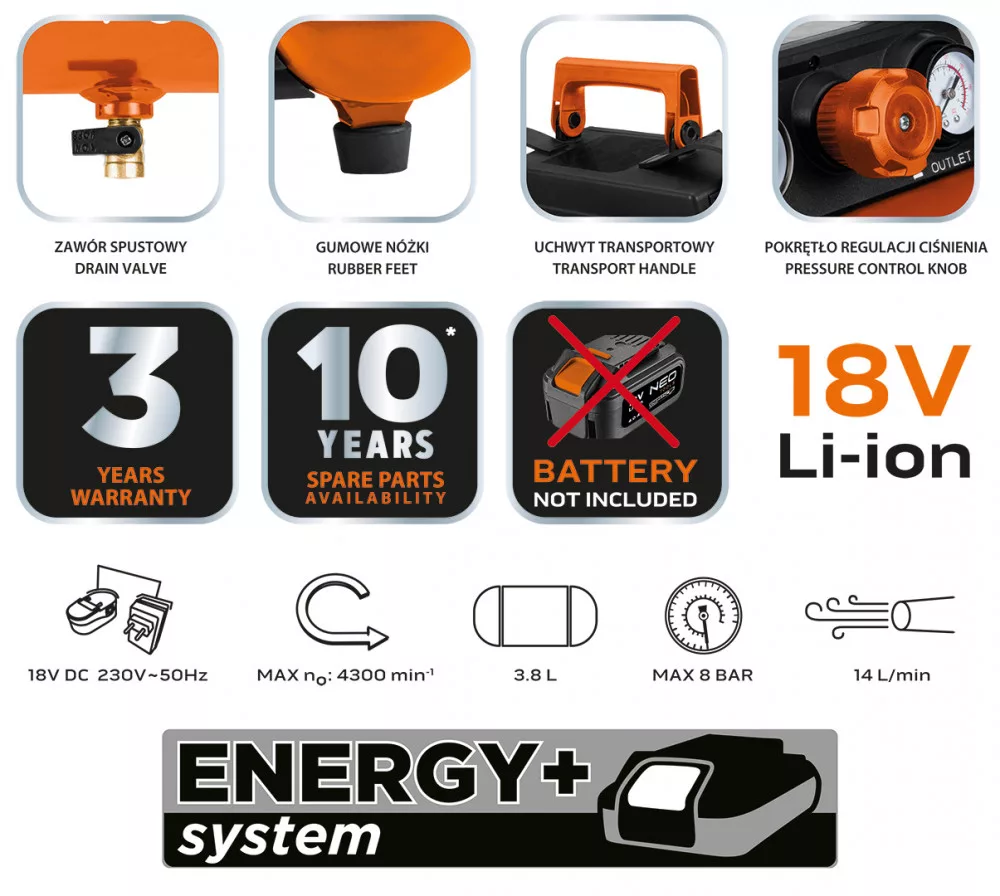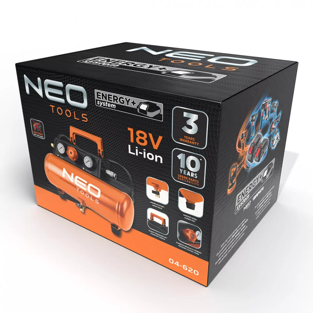 Az Energy+ 18 Voltos, 04-620 cikkszámú akkumulátoros kompresszor a NEO-tól egy olajmentes készülék, amely az Energy+ akkumulátoros rendszerrel működik. Tartálykapacitása 3,8 liter, maximális nyomása 8 bar, teljesítménye pedig 14 liter/perc. A NEO kompresszor szennyeződések lefújásához és kisebb pneumatikus szerszámok működtetéséhez ajánlott. Hasznos lesz autórajongóknak, szerelőknek, csavaros hobbistáknak és otthoni használatra. A készülék üresjárati ideje 2 Ah-s akkumulátorral 10 perc, 4 Ah-s akkumulátorral 20 perc, 6 Ah-s akkumulátorral 30 perc. Számos feladatra ajánlott készülék.