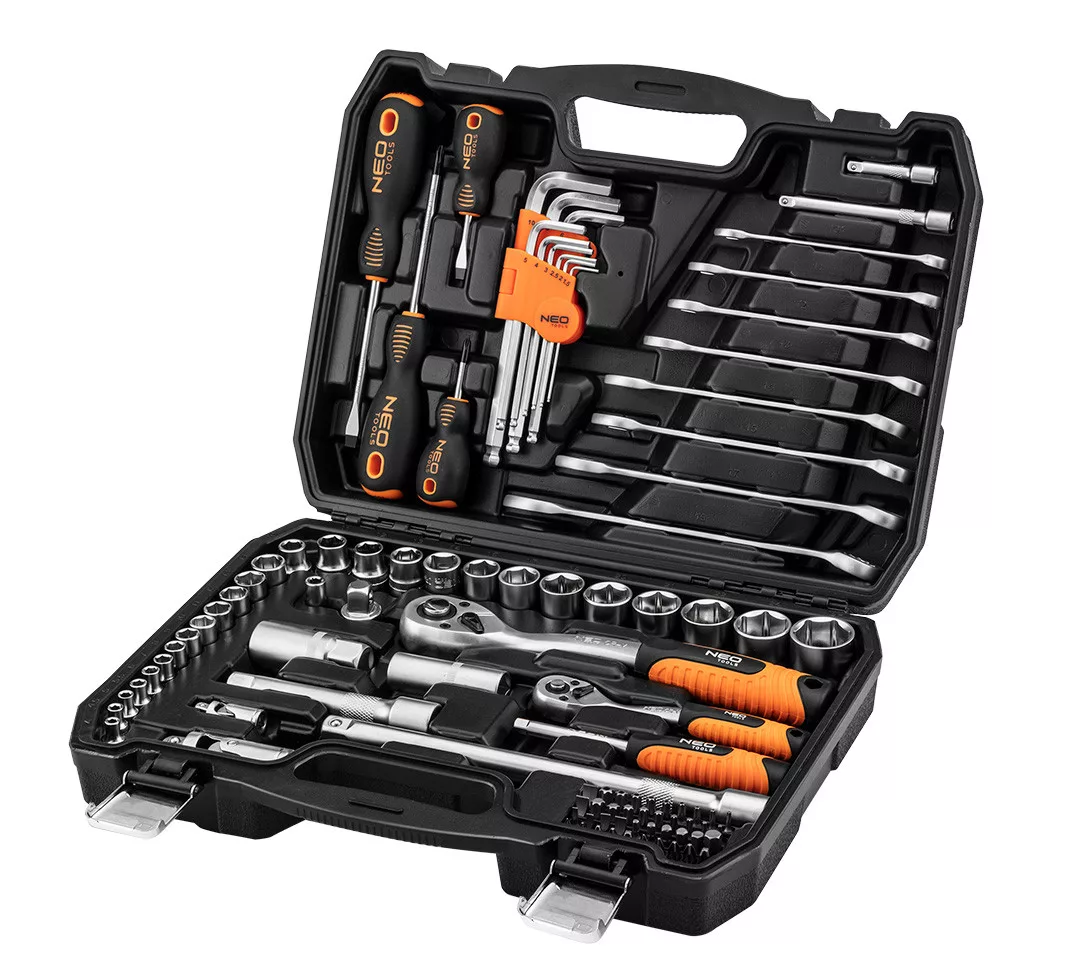 A NEO kulcskészlet 100 darabból áll, kiváló minőségű króm-vanádium acélból. A készlet két racsnis kulcsot tartalmaz, amelyek tartós racsnis mechanizmussal (72 fogú) és ergonomikus fogantyúval vannak felszerelve. A készlet tartalmaz 1/2"-os dugókulcsokat (10 és 27 mm közötti méretben), 1/4"-os dugókulcsokat (4 és 14 mm közötti méretben) és 1/4"-os csavarhúzóhegyeket (lapos, Phillips, hexa, Torx). Ezt egészíti ki a 9 db hatlapos kulcs, gyertyakulcsok, hosszabbítók, csuklók, adapterek, csavarhúzók és egy kombinált kulcskészlet. Az egész készletet egy praktikus és robusztus műanyag tokban szállítjuk. A termék megbízhatóságát a 25 év törésgarancia igazolja.