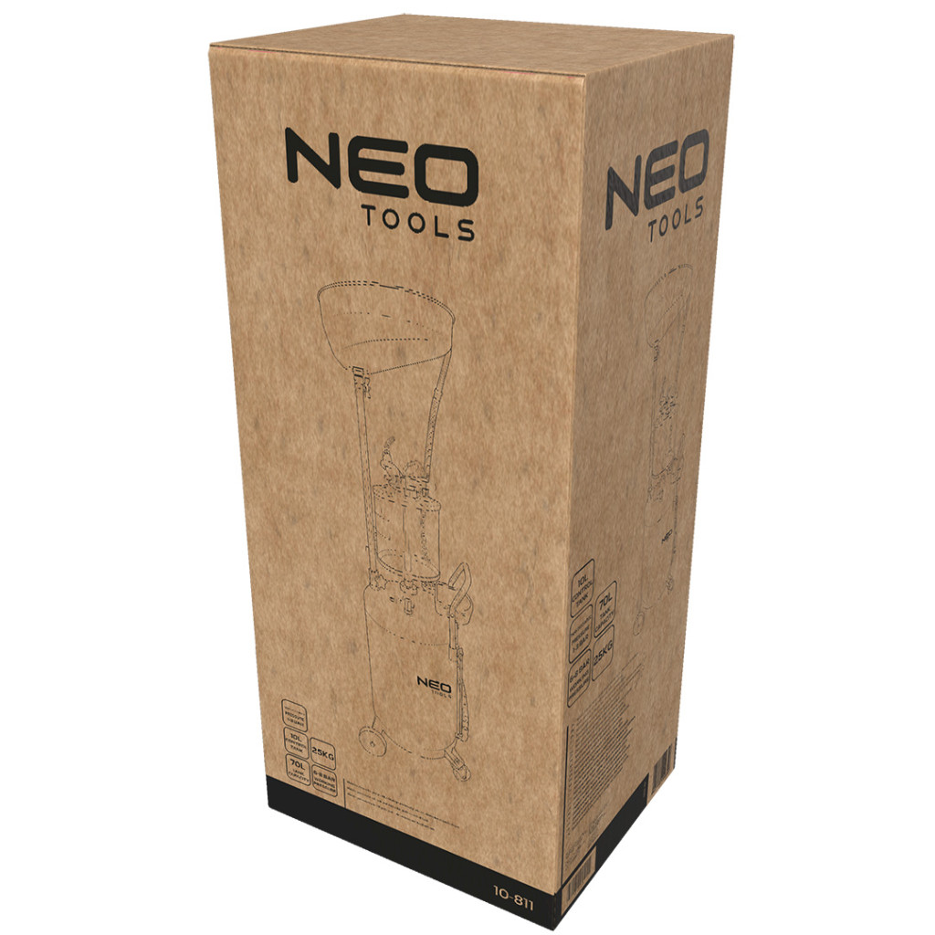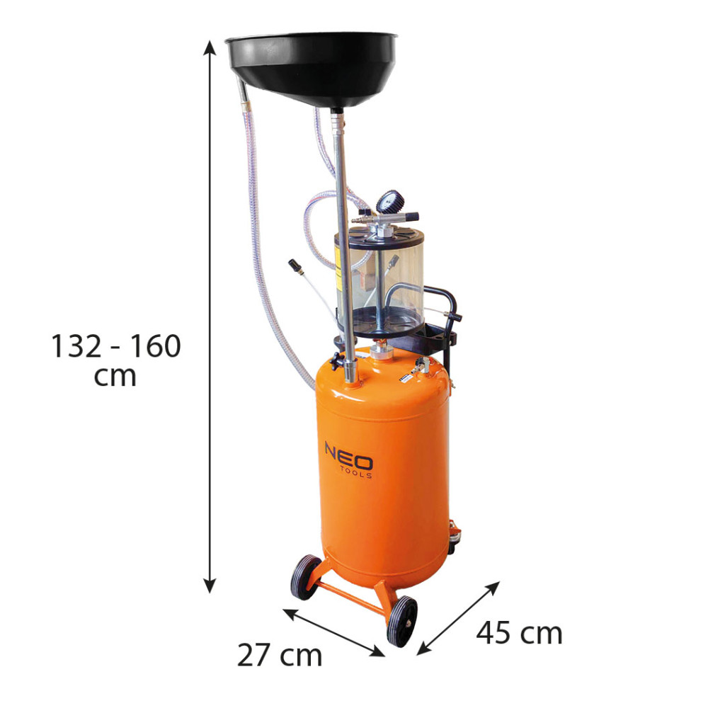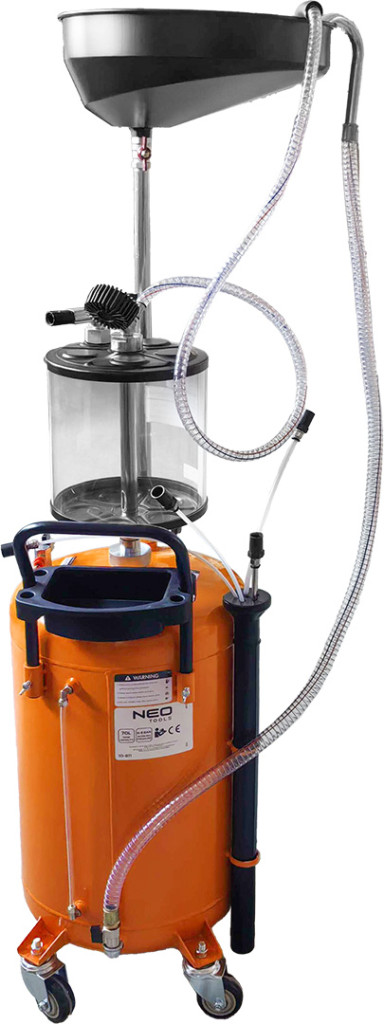 NEO 10-811 Mobil olajleeresztő/ leszívó készülék, pneumatikus, leeresztő tál 10l, ellenőrzőhenger 10l, gyűjtőtartály 70l. A készülék 1-3 bar tartályürítési nyomást és 6-8 bar üzemi nyomást biztosít.