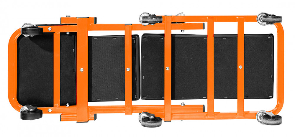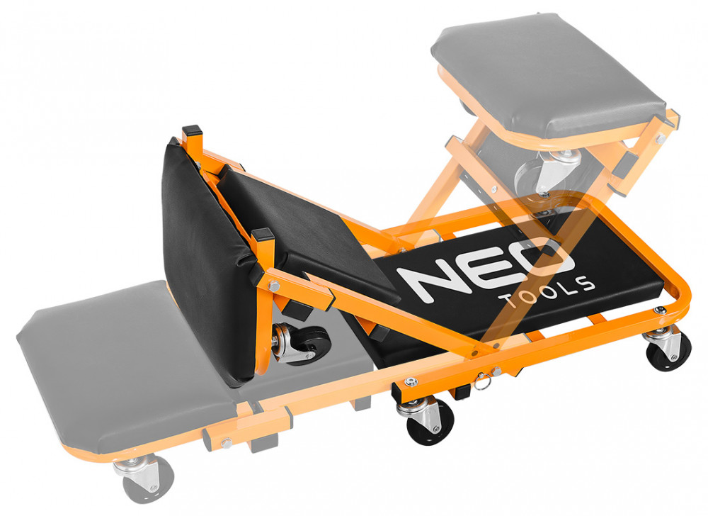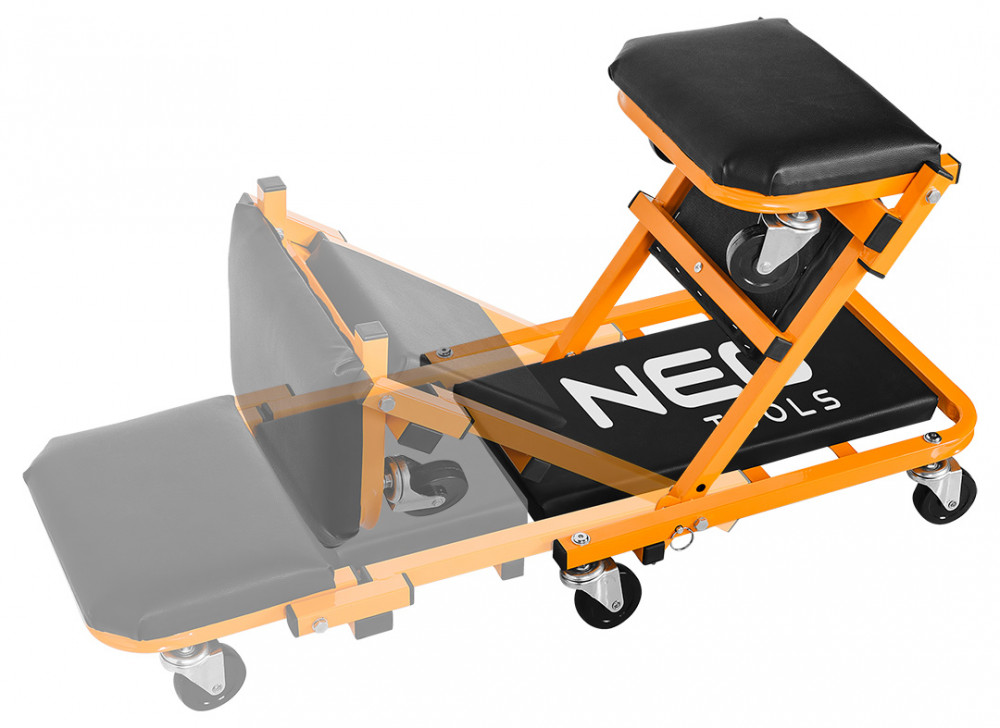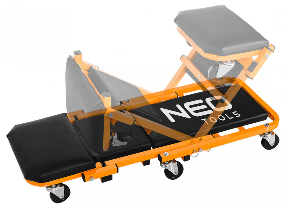 NEO szerelőágy és szék egyben. Ez a jól ismert modell továbbfejlesztett változata, a fej és háttámla alatti kiegészítő megerősítéssel, 75 mm átmérőjű nagyobb kerekekkel , amelyek olajálló és csillapító tulajdonságokkal rendelkező hőre lágyuló poliuretán elasztomerrel bevont polipropilénből készültek. A rugalmasabb, ökológiai műbőrből készült kárpitozás hozzájárul a használat kényelméhez. Az ágy egyetlen mozdulattal kényelmes műhelyüléssé alakítható. Méretei nyitott állapotban 40 x 14 x 102 cm, míg székként 54,5 x 40 x 48 cm. A vázprofil 25 x 25 x 1 mm, a teherbírás 150 kg (ágy) és 120 kg (szék). A NEO márka terméke hatékony munkát tesz lehetővé az autó alatt és megkönnyíti a munkát.