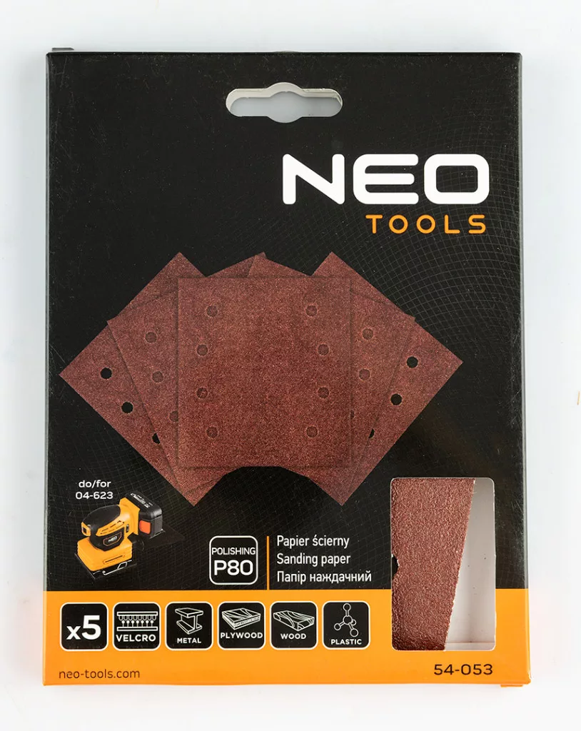NEO 54-053 Csiszolópapír,tépőzáras, 113 x 113 mm, P80, 8 lyukas, 5db-os. Egy 5 darabból álló papírkészlet, amelyet a 04-623 NEO TOOLS rezgőcsiszoló géphez ajánlunk. A csiszolópapírok praktikus tépőzárral vannak rögzítve és 8 lyukat tartalmaznak. Jól használhatóak fához, fémhez, műanyaghoz és gipszkartonhoz. P80-as szemcsefinomság és 113 x 113 mm-es méret jellemzi őket. A NEO TOOLS csiszolópapírokat a barkácsolás szerelmeseinek ajánljuk számos projekthez.