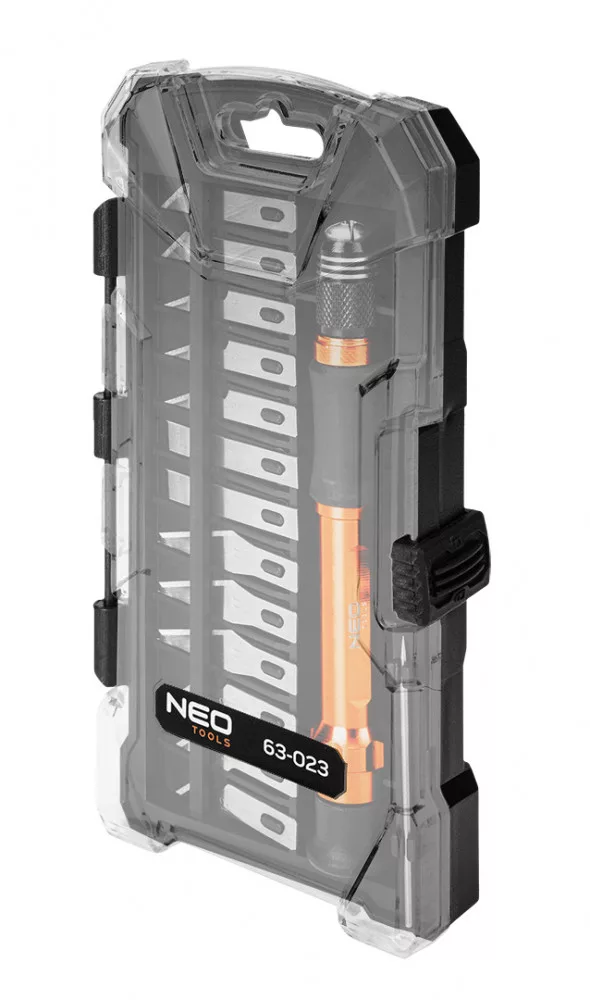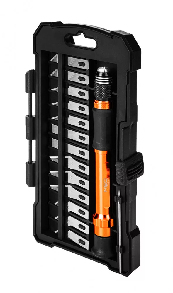 Precíziós kések, 14 db-os készlet, 63-023 cikkszámmal. A NEO TOOLS készlet egy univerzális megoldás a barkácsolók és modellezők számára. A 14 darabból álló készlet, amely 13 különböző pengét és egy nyelet tartalmaz, ideális a precíziós munkákhoz. A pengék kiváló minőségű CK75 acélból készülnek, amely szilárdságáról és élességéről ismert, és garantálja a pontos vágásokat.