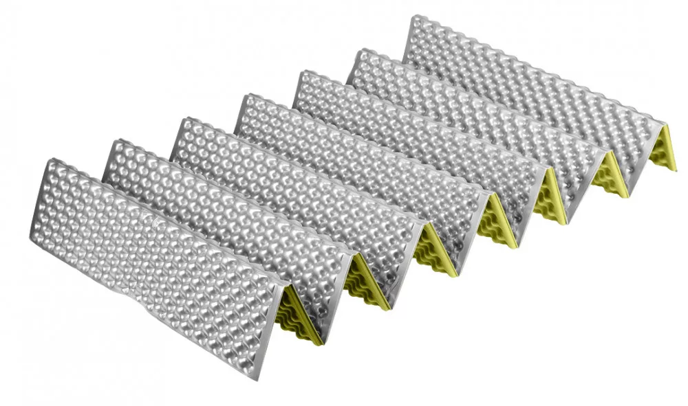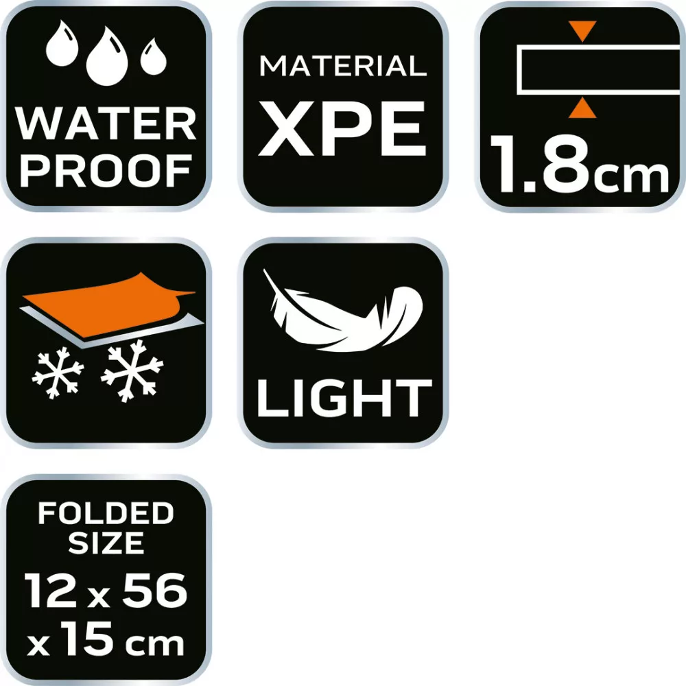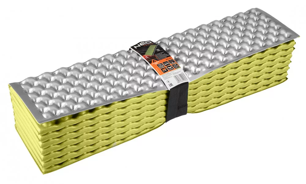 A NEO TOOLS 63-161 összecsukható hálózsák alátét egy XPE habból készült termék, aluminimum fedéssel, méretei 185 x 56 x 1,8 cm (kibontott állapotban) és 12 x 56 x 15 cm (összehajtott állapotban). Könnyű, 320 g-os súlya jellemzi, így könnyen és kényelmesen hordozható. A NEO TOOLS összecsukható alátét vízálló tulajdonságokkal rendelkezik. Emellett jó hőszigetelést biztosít a talajjal szemben. Alkalmas túrázáshoz és kempingezéshez. A mellékelt gumiszalagnak köszönhetően hátizsákhoz vagy bőröndhöz rögzíthető.